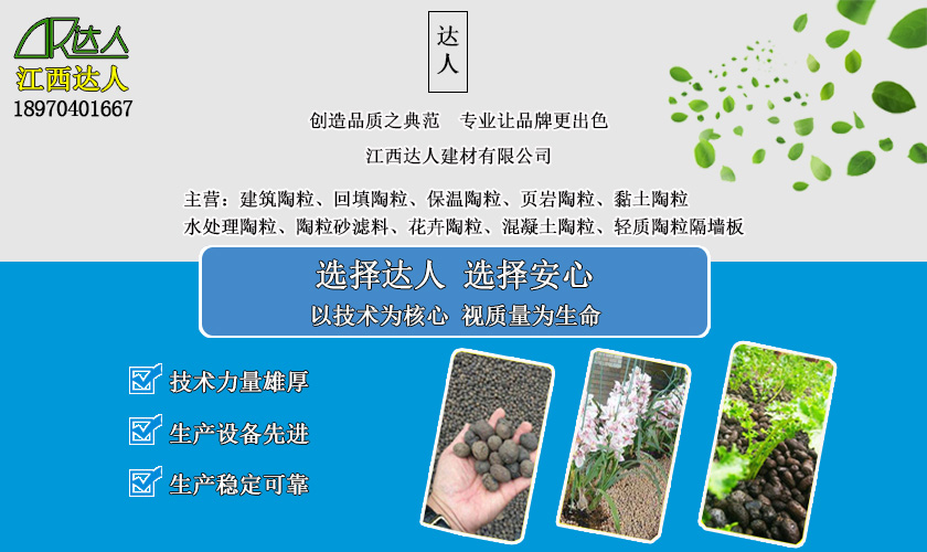 江西達人建材有限公司所生產的陶粒輕質性更佳,具有密度小、強度高、吸水率大、保溫、隔熱、耐火、抗震等特點,用途十分廣泛,在取代普通砂石配制輕集料混凝土,用作水處理濾料、吸附劑、透水路面材料甚至于農業、園林中無土培養基、橋面板。空心砌塊等建材原料都有著十分耀眼的表現;